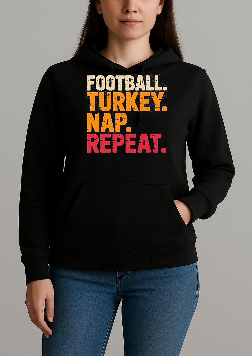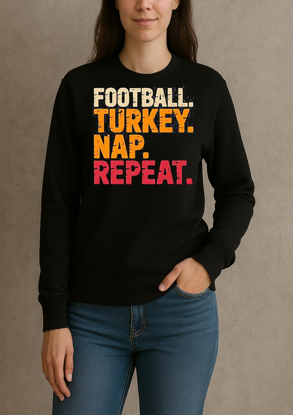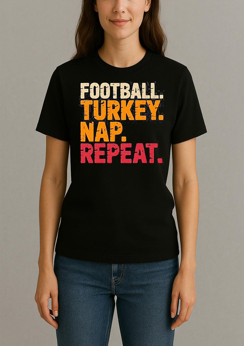 Pair your Football Turkey Nap Repeat Funny Thanksgiving Shirt with jeans, joggers, or a jacket for a trendy, effortless look. Perfect for casual outings, creative events, or as a thoughtful gift for a fashion-forward friend.