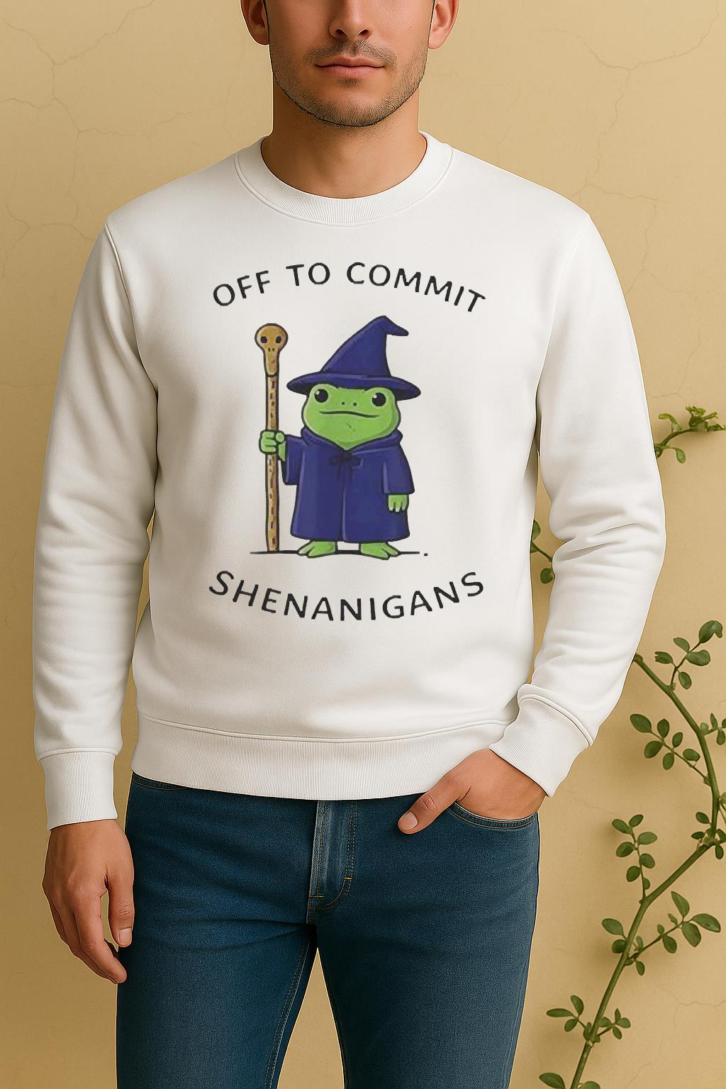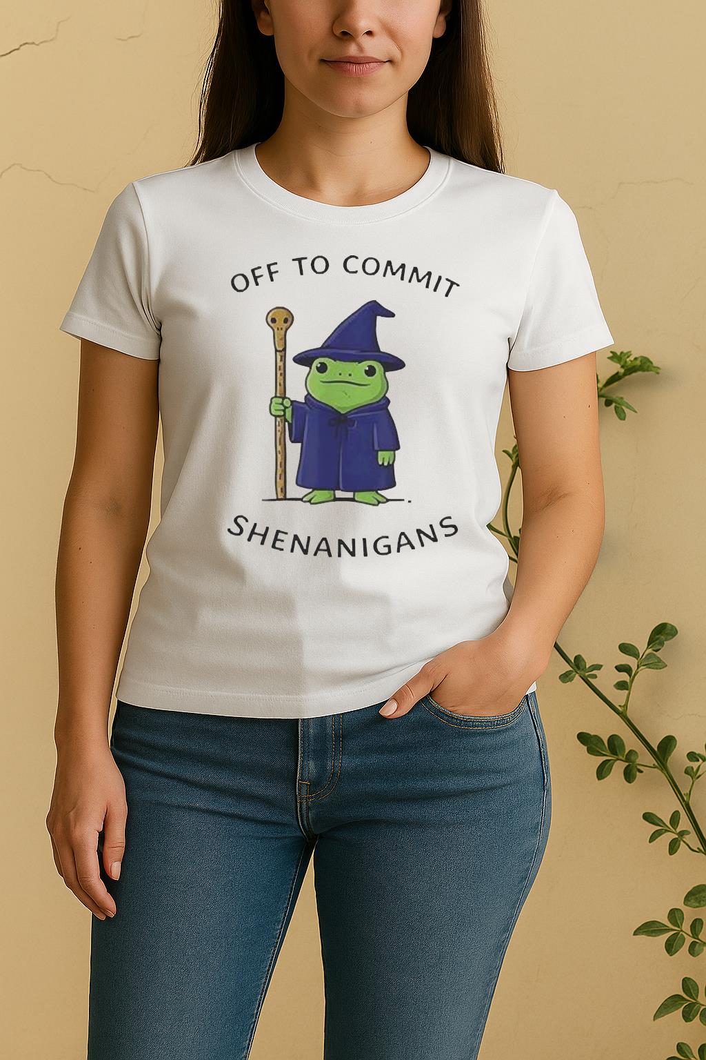 Pair your Frog Wizard Off To Commit Shenanigans Quote Shirt with jeans, joggers, or a jacket for a trendy, effortless look. Perfect for casual outings, creative events, or as a thoughtful gift for a fashion-forward friend.