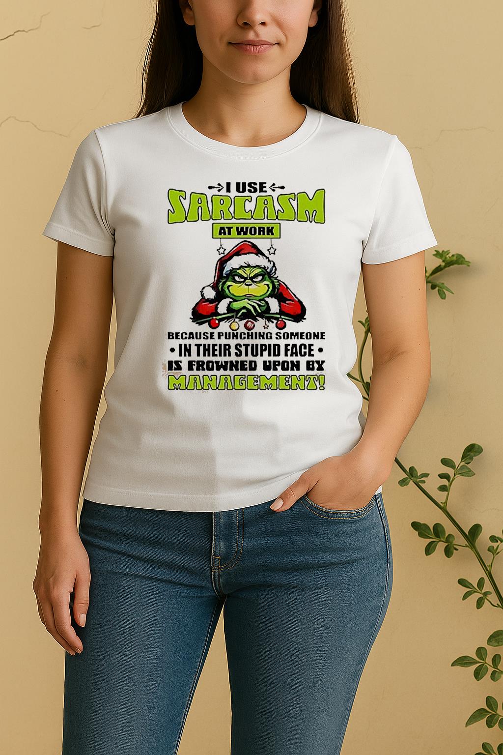 The standout feature of the Grinch I Use Sarcasm At Work Because Punching Someone Shirt is its exclusive custom artwork, printed with eco-friendly inks to ensure long-lasting vibrancy and detail. Every element reflects confidence, creativity, and individuality.