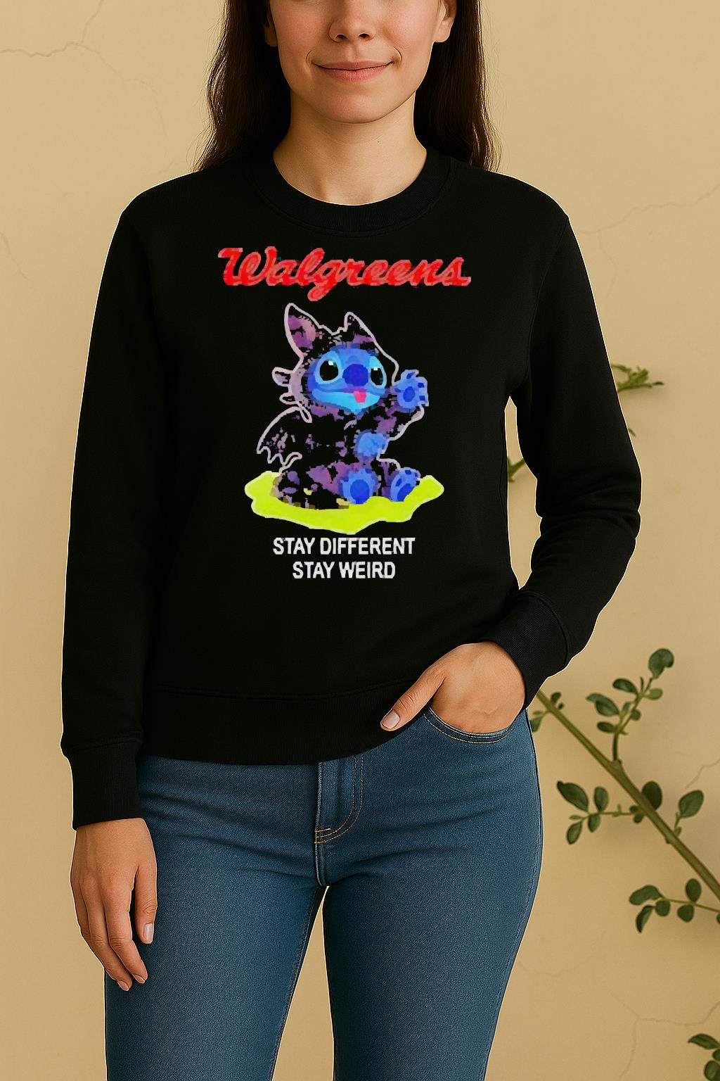 Pair your Happy Stitch Cosplay Toothless X Walgreens Stay Different Stay Weird Shirt with jeans, joggers, or a jacket for a trendy, effortless look. Perfect for casual outings, creative events, or as a thoughtful gift for a fashion-forward friend.