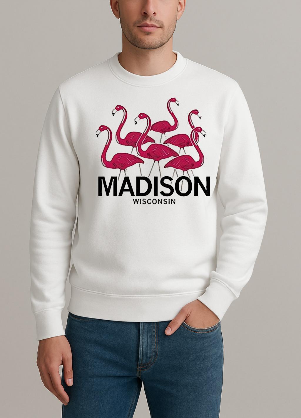 Pair your Madison Wisconsin Loves Pink Flamingos Shirt with jeans, joggers, or a jacket for a trendy, effortless look. Perfect for casual outings, creative events, or as a thoughtful gift for a fashion-forward friend.