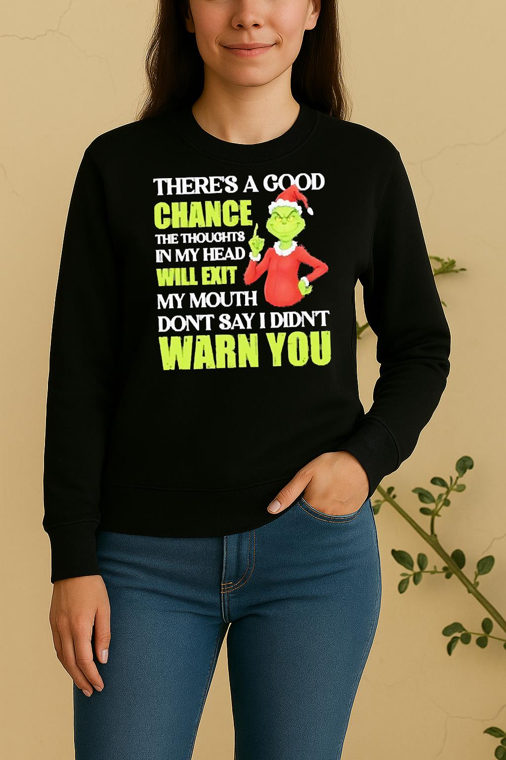 Pair your Officials Grinch Theres A Good Chance The Thoughts In My Head Will Exit My Mouth Dont Say I Didnt Warn You Christmas Shirt with jeans, joggers, or a jacket for a trendy, effortless look. Perfect for casual outings, creative events, or as a thoughtful gift for a fashion-forward friend.