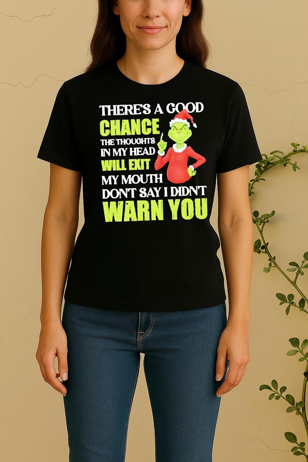 The standout feature of the Officials Grinch Theres A Good Chance The Thoughts In My Head Will Exit My Mouth Dont Say I Didnt Warn You Christmas Shirt is its exclusive custom artwork, printed with eco-friendly inks to ensure long-lasting vibrancy and detail. Every element reflects confidence, creativity, and individuality.