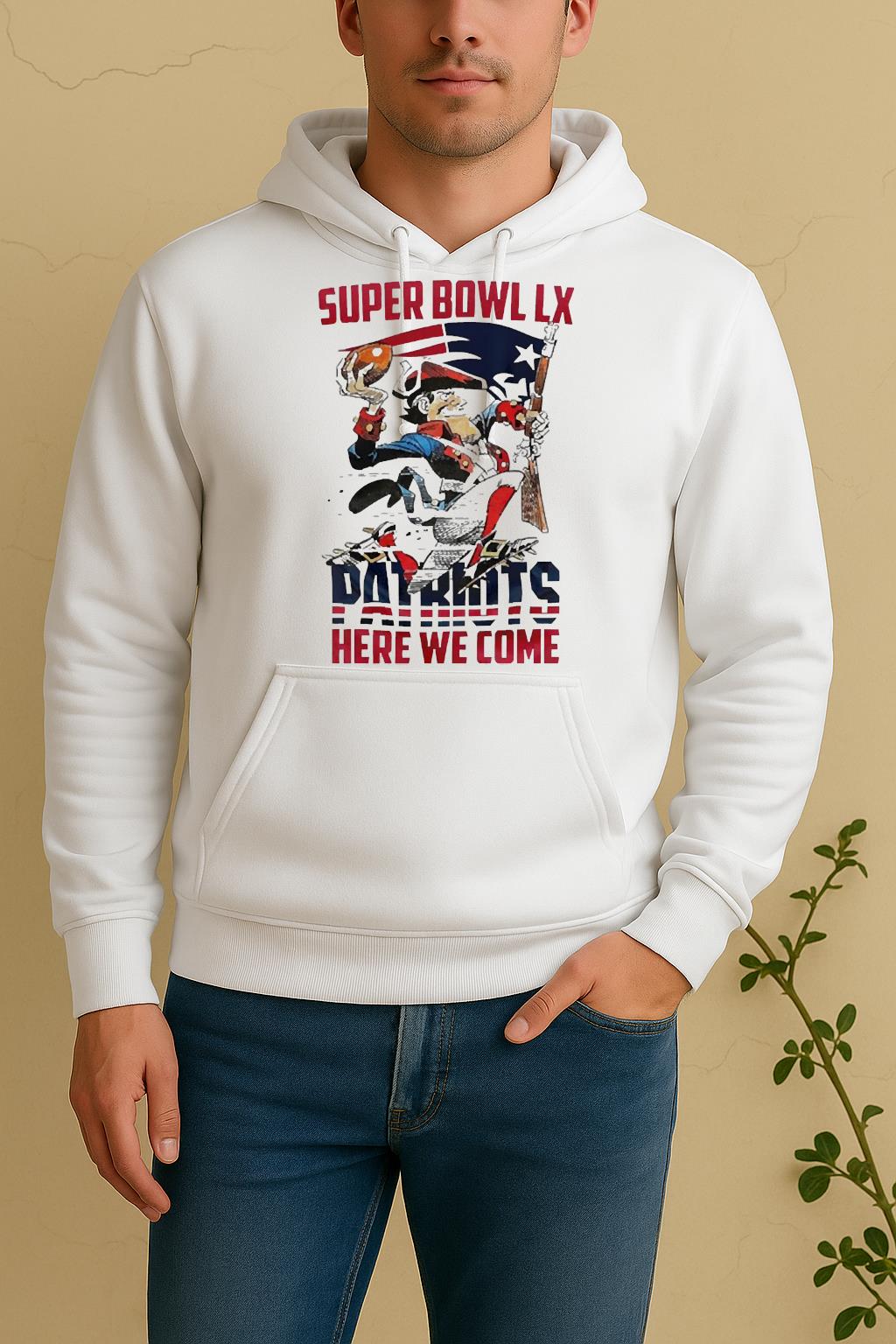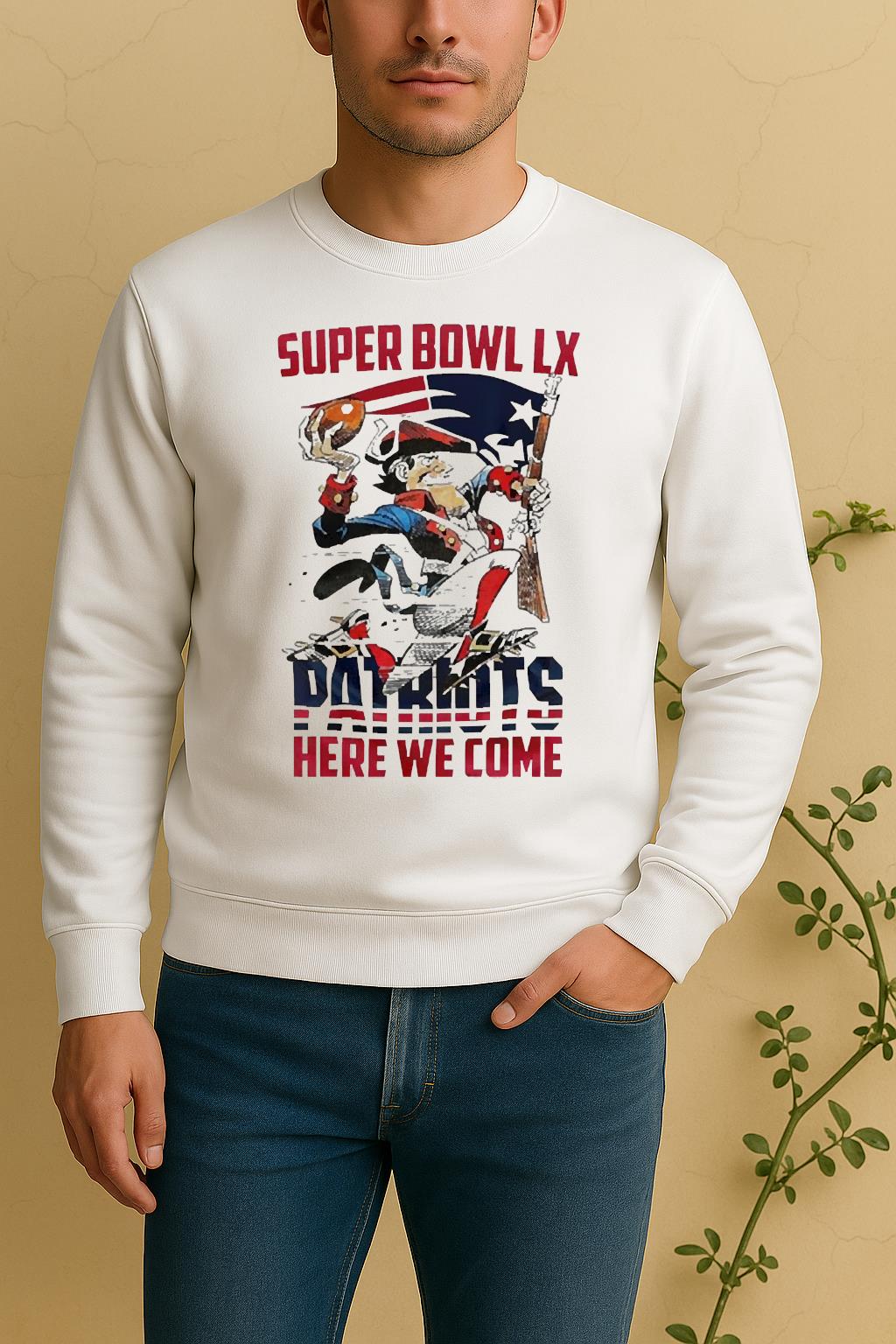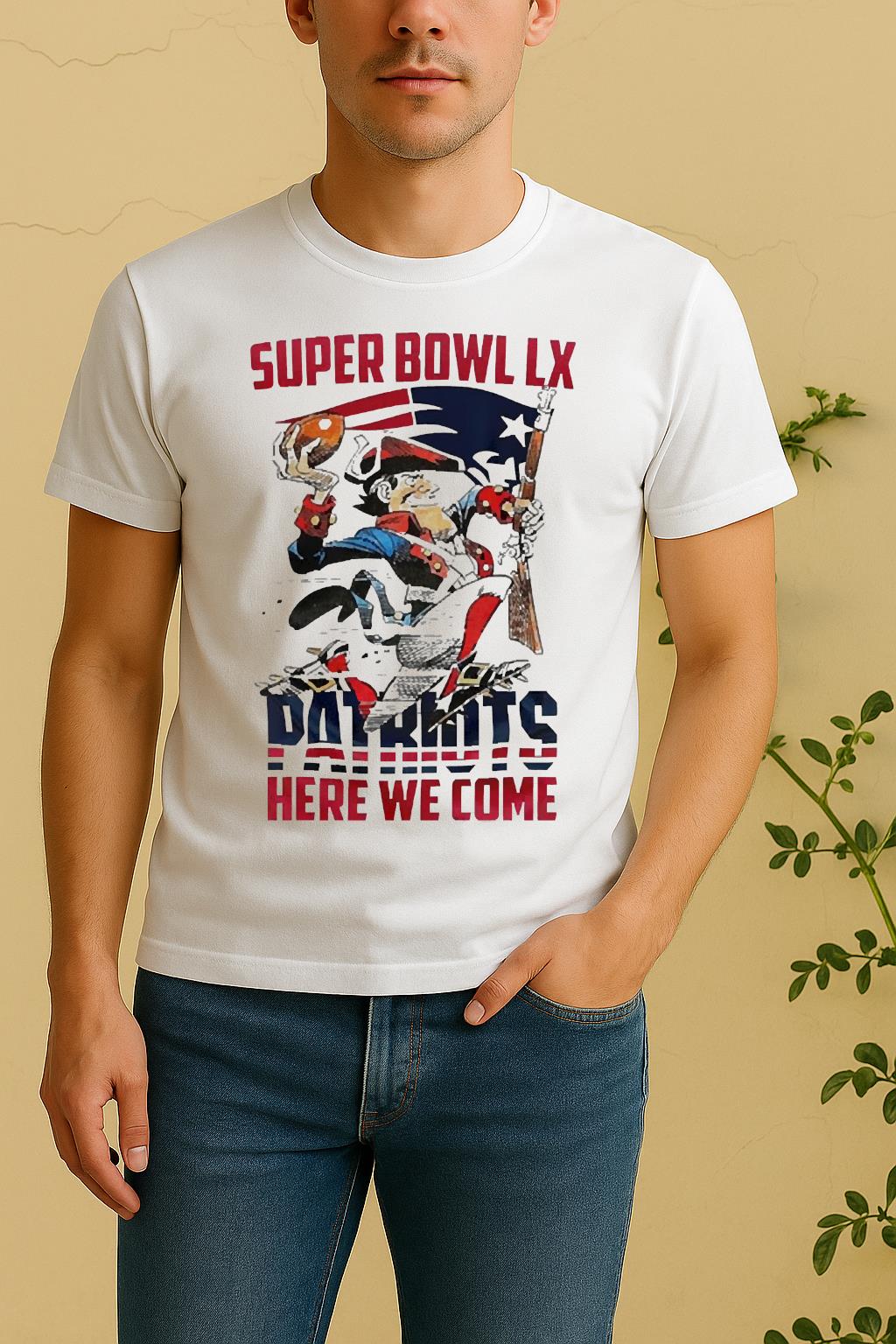 The standout feature of the Officials New England Patriots Nfl 2025 Division Champions Super Bowl Lx Patriots Here We Come Mascot Shirt is its exclusive custom artwork, printed with eco-friendly inks to ensure long-lasting vibrancy and detail. Every element reflects confidence, creativity, and individuality.