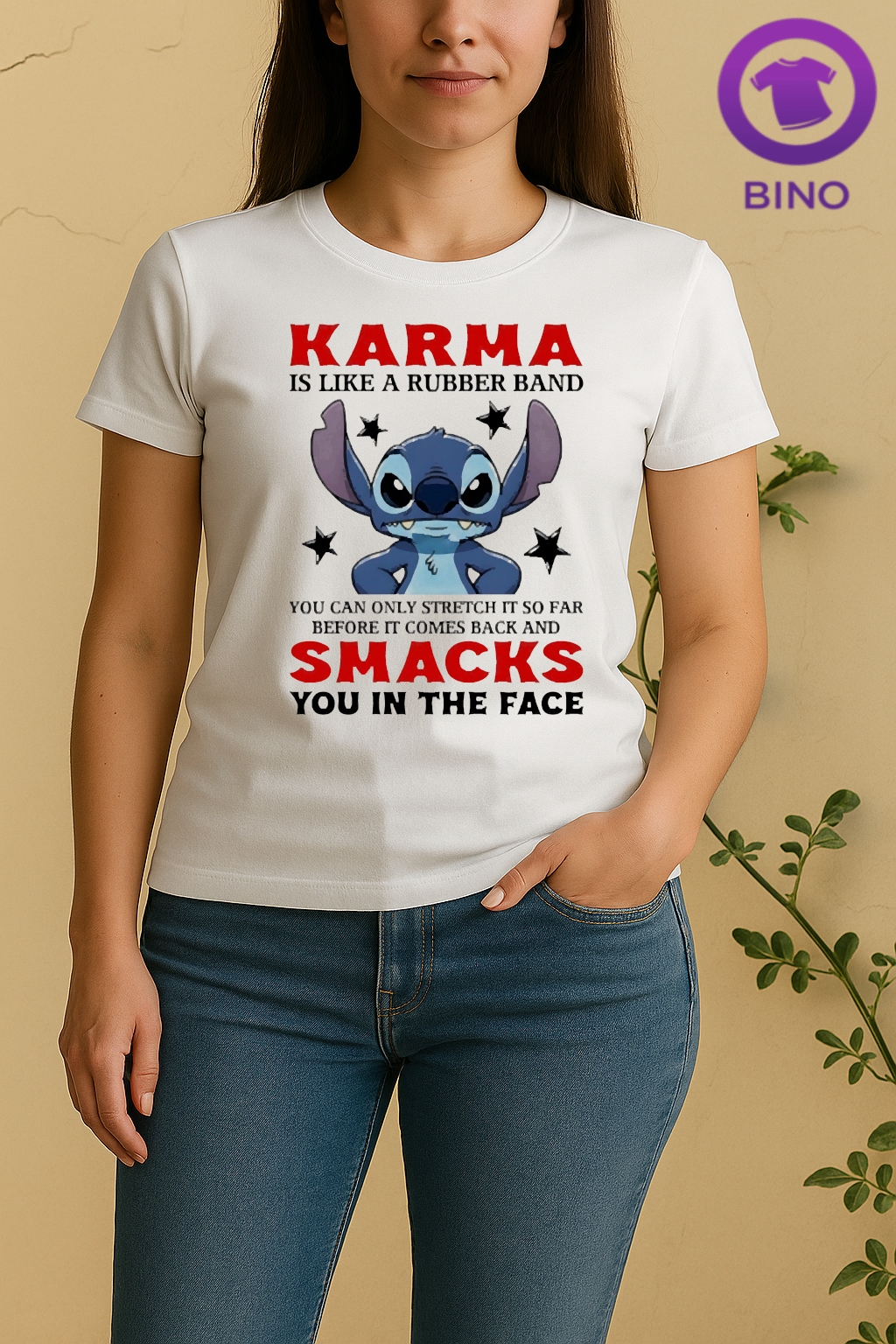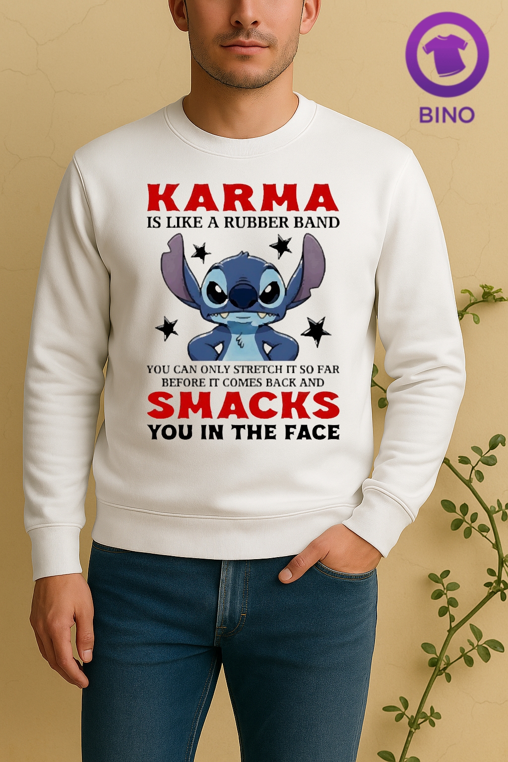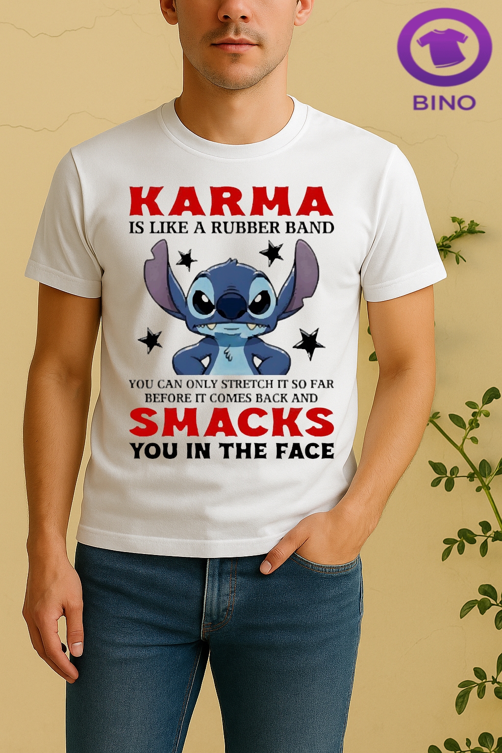 Whether you’re out with friends or capturing the perfect streetwear vibe, our Officials Stitch Karma Is Like A Rubber Band You Can Only Stretch It So Far Before It Comes It Comes Back And Smack Shirt combines effortless style with modern attitude, letting you stand out, stay comfortable, and make every moment your own. Use coupon “10OFF” to get 10% off total order value if over 75 USD.