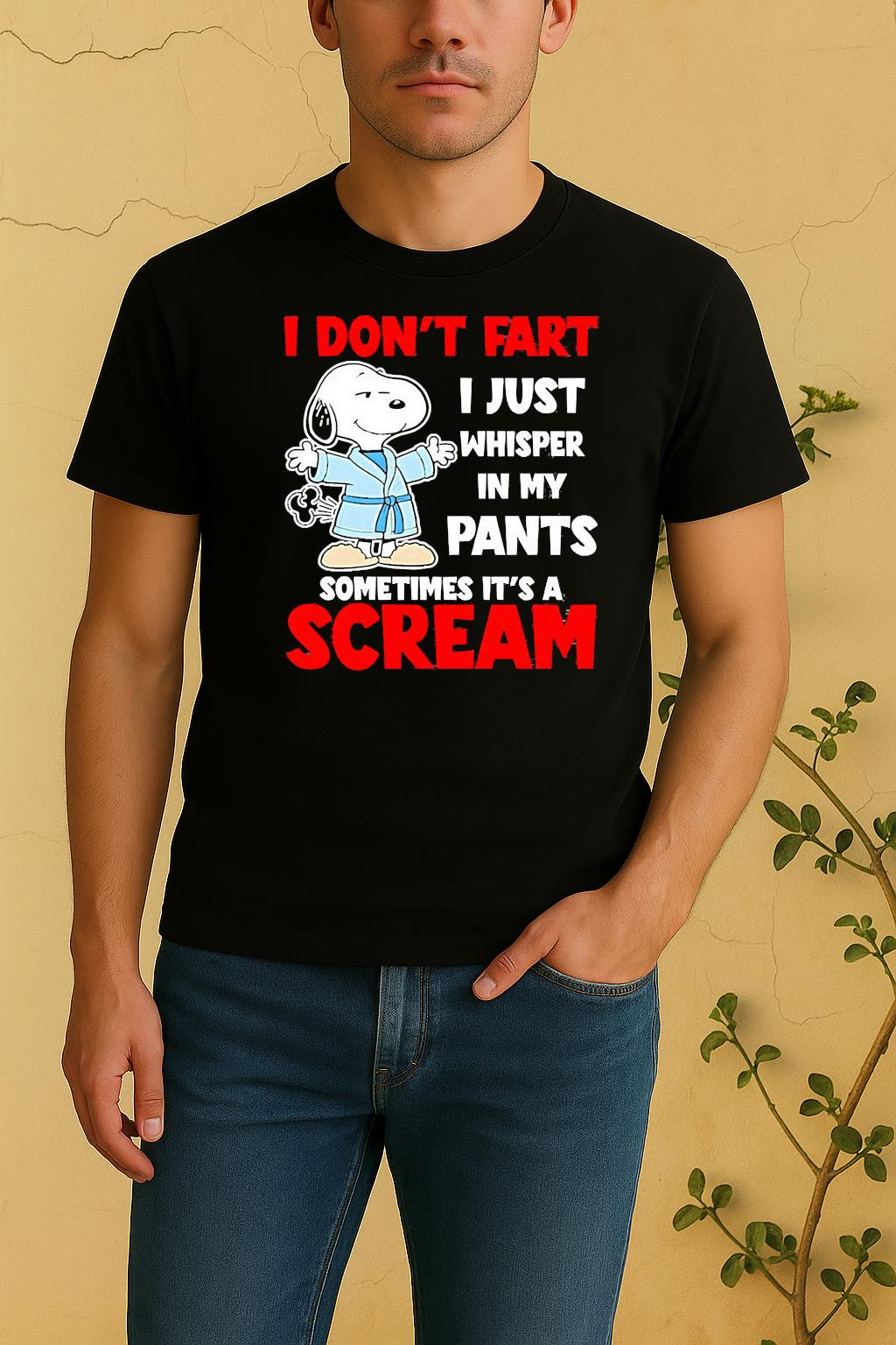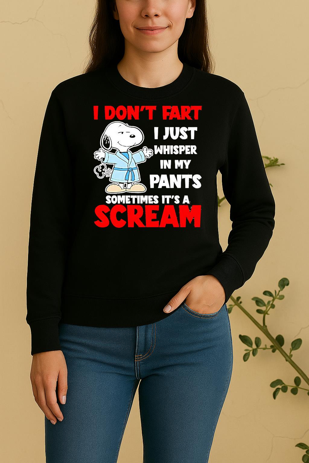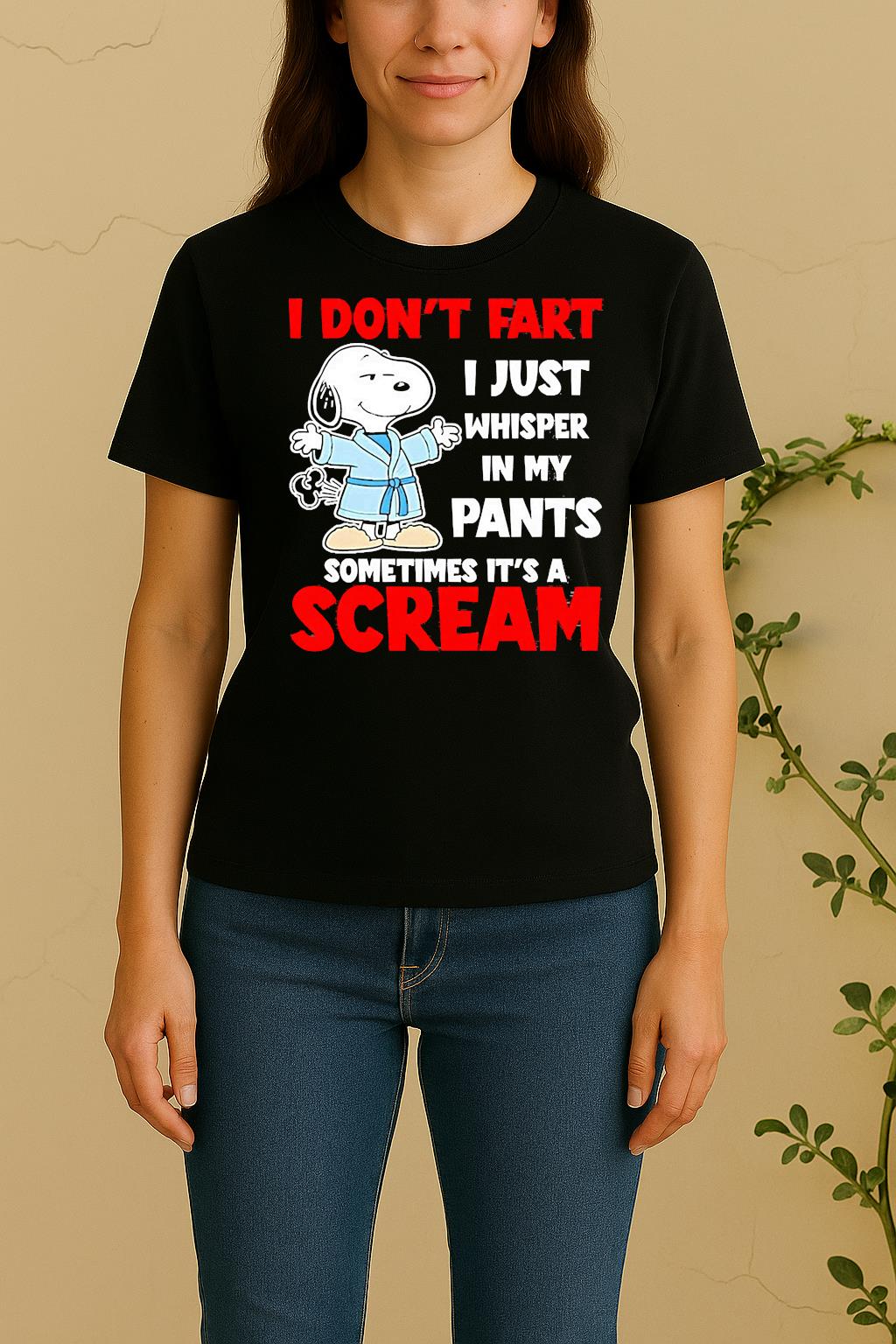 Each Snoopy I Dont Fart I Just Whisper In My Pants Sometimes Its A Scream Shirt is made from soft, breathable cotton and a durable fabric blend that feels gentle on the skin. The high-quality print ensures vibrant colors that won’t fade after washing. Lightweight, flexible, and built for comfort — ideal for all-day wear.