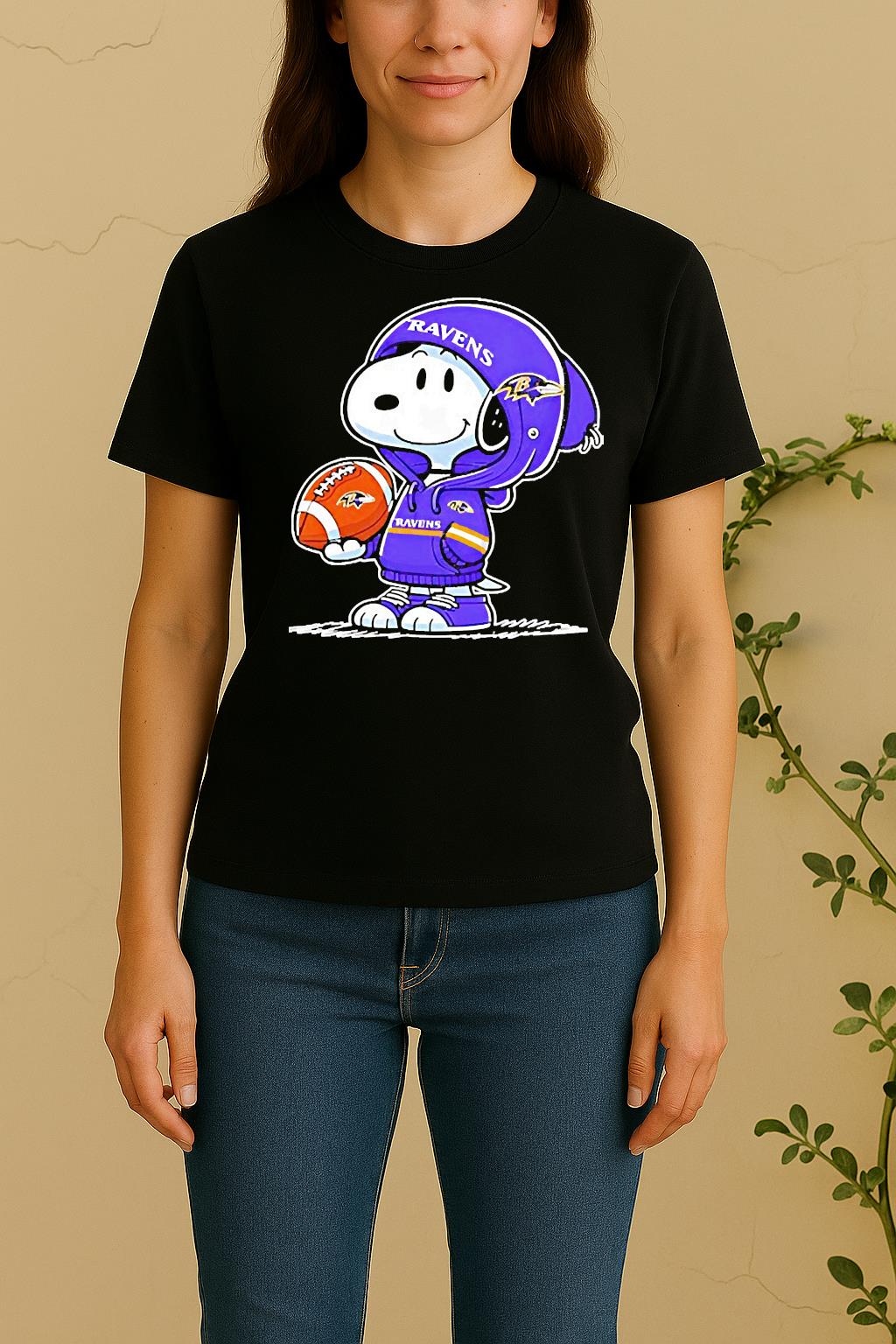Pair your Snoopy Wears Baltimore Ravens Football Shirt with jeans, joggers, or a jacket for a trendy, effortless look. Perfect for casual outings, creative events, or as a thoughtful gift for a fashion-forward friend.
