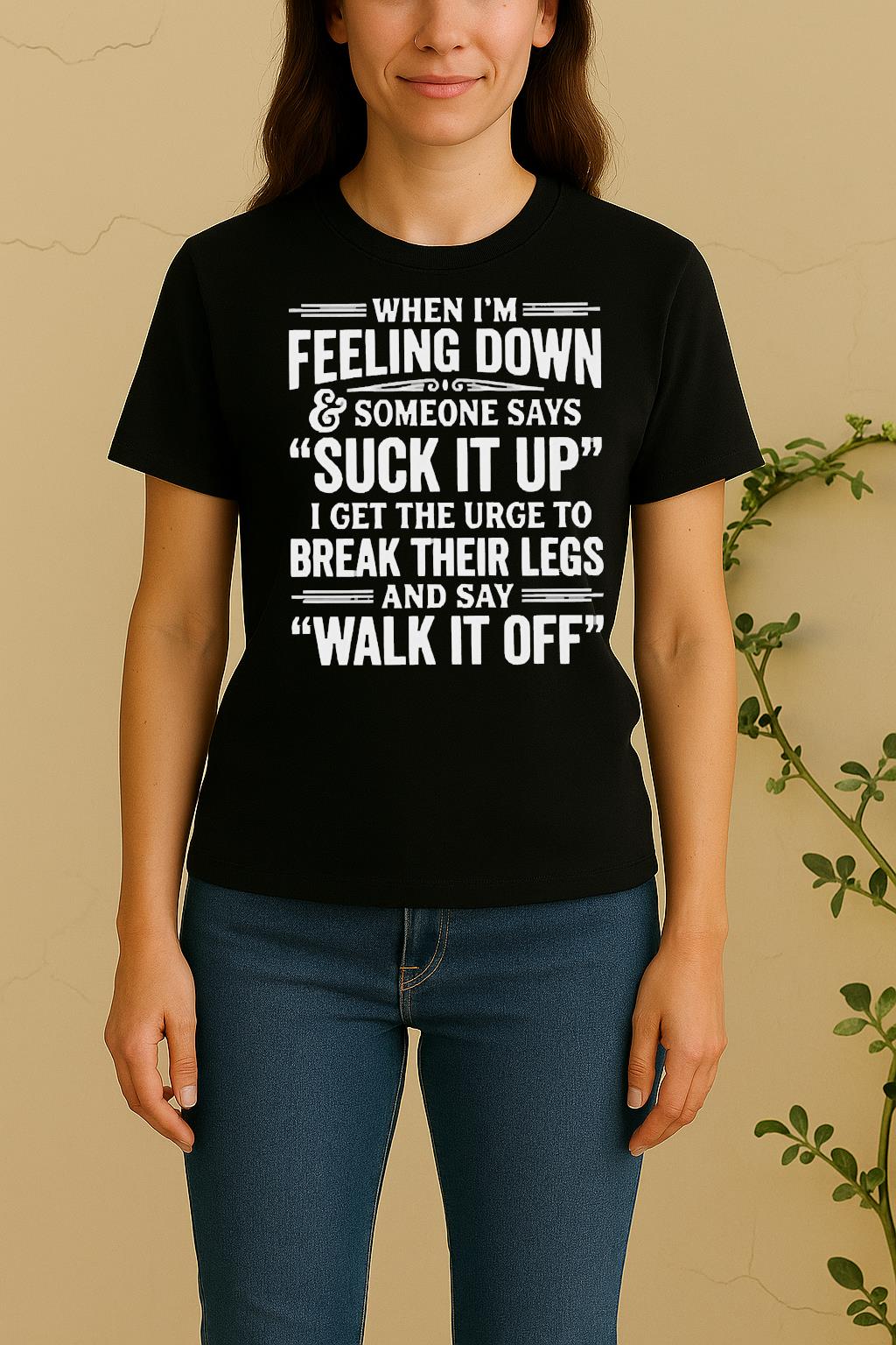 The standout feature of the When Im Feeling Down And Someone Says Suck It Up I Get The Urge To Break Their Legs Shirt is its exclusive custom artwork, printed with eco-friendly inks to ensure long-lasting vibrancy and detail. Every element reflects confidence, creativity, and individuality.